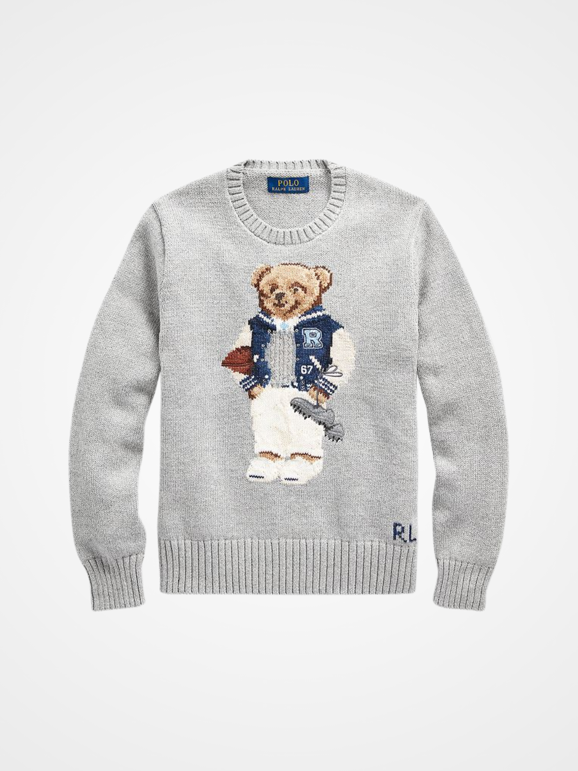 Dressed in a letterman jacket and football gear, this charming bear adds a playful, sporty touch to the jumper.